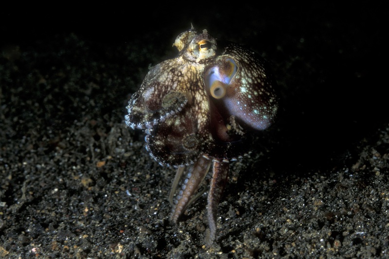 初時我不以為然,繼續專注拍攝一隻浮游著的毛背魚。透過觀景器,我欣賞著那隻背鰭如絲線般纖細的毛背魚,突然一隻高大笨拙的東西在背後移動。似乎有點不尋常。我放下相機,才驚覺那隻椰殼章魚捲起了牠的前足,只用後腿支撐著身體。真不敢相信自己的眼睛:那章魚用牠豎立起來的三足走起路來!我實在太興奮了,把拍照的事忘記得一乾二淨,除了這唯一的一張。
