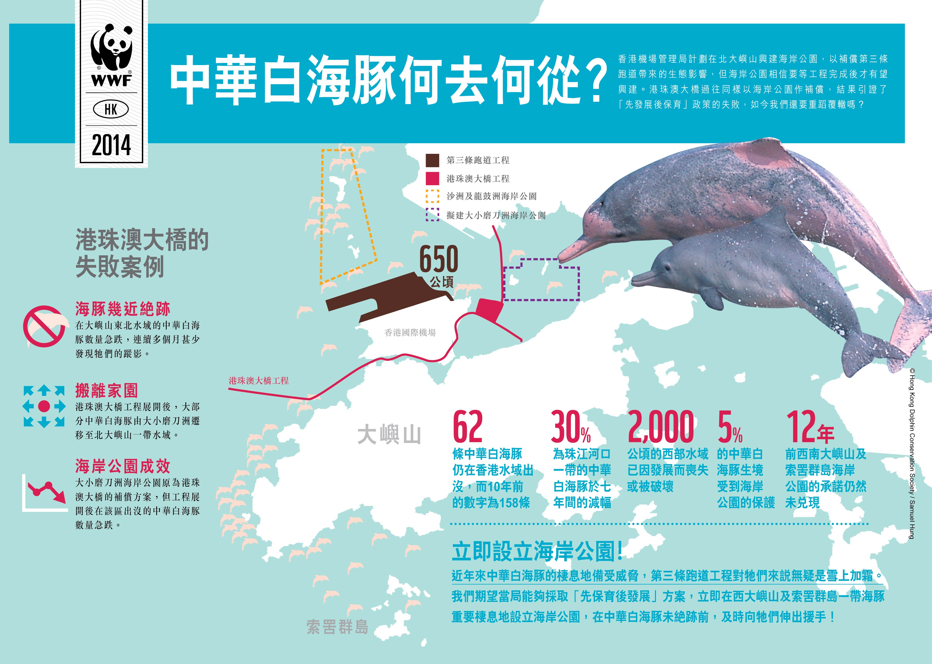 香港機場管理局今日發表第三條跑道環境評估報告,建議在2023年,即所有工程完結後設立一個新的海岸公園,連接現有的沙洲及龍鼓洲海岸公園,以及尚未落實的大小磨刀洲海岸公園,以作興建第三條跑道的補償。世界自然基金會香港分會(WWF)對此建議深表憤怒,質疑機管局對保育海豚毫無決心和誠意,要求當局重新審視環境補償方案的成效,並從過往失敗案例中學習,同時立即在三跑工程開展前在西部水域設立兩個海岸公園。本會警告,若海岸公園須延至2023年落成,屆時中華白海豚極有可能已經絕跡本港水域。