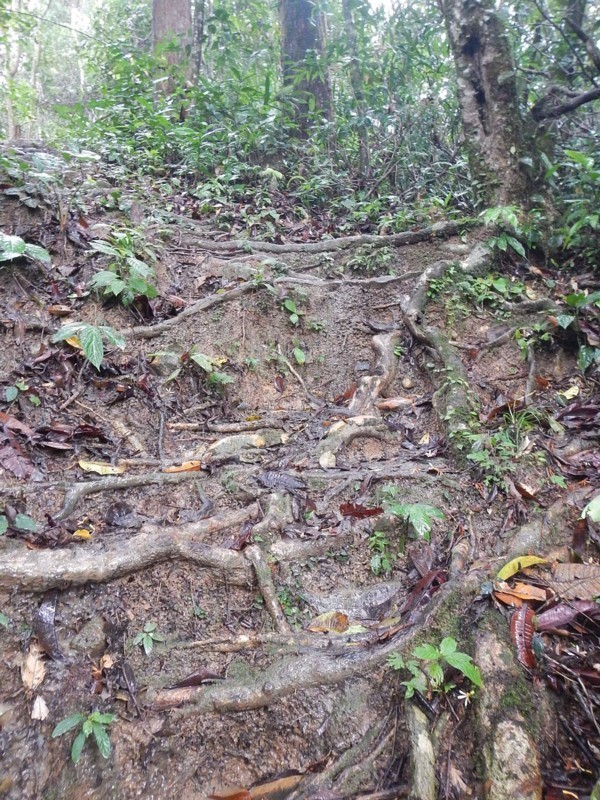 ▲馬來西亞熱帶雨林:別看路面好像很濕滑,有樹根構成的天然樓梯就可讓你安然步過。