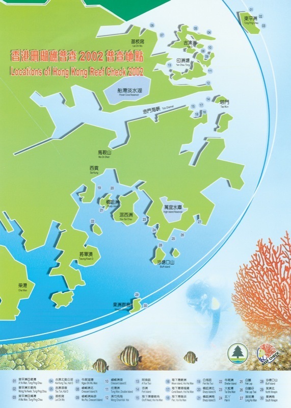 2002年的珊瑚礁普查刷新了兩項新紀錄,一是最多義務潛水員(超過300位)參與,二是進行普查的地點高達30個,廣佈於香港東面水域,由北面的東平洲一直伸展至南面的果洲群島。在這30個普查地點中,其中20個錄得相當高的珊瑚覆蓋率,高於50%。這些地方包括東面的三個海岸公園和一些有機會被列作海岸公園的地方如吉澳、娥眉洲、浪茄、白腊和沙塘口山等。在26種的指標品種中,在是次普查中共錄得20種,常見的如石斑、蝴蝶魚、海膽、海參及寶貝螺等。而大部分的普查地點無論在品種數目及數量上都較2001年為高。至於人為破壞,只有個別普查地點發現棄置垃圾,而破壞性捕魚的痕跡甚至是全無紀錄。另外,罋缸灣沙塘口山的珊瑚以往一向都有被船錨損毀的紀錄;但是次普查發現,那裡最近已沒珊瑚遭船錨損毀,實在令人欣慰。