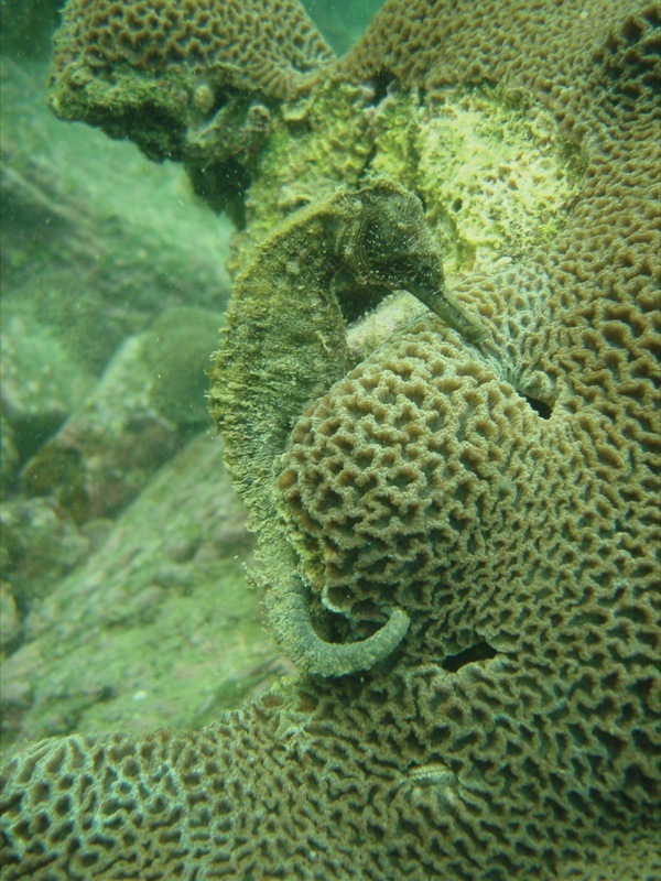 在珊瑚群落中找到一隻海馬 © Choyce Choi