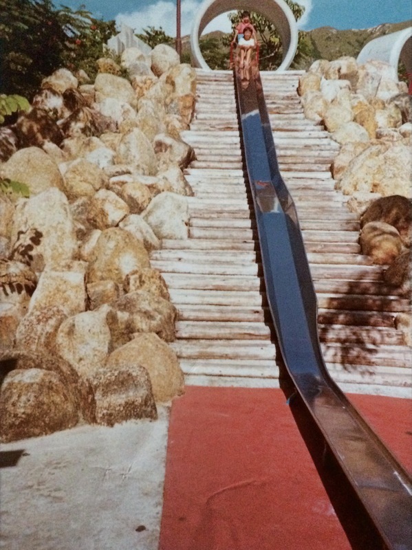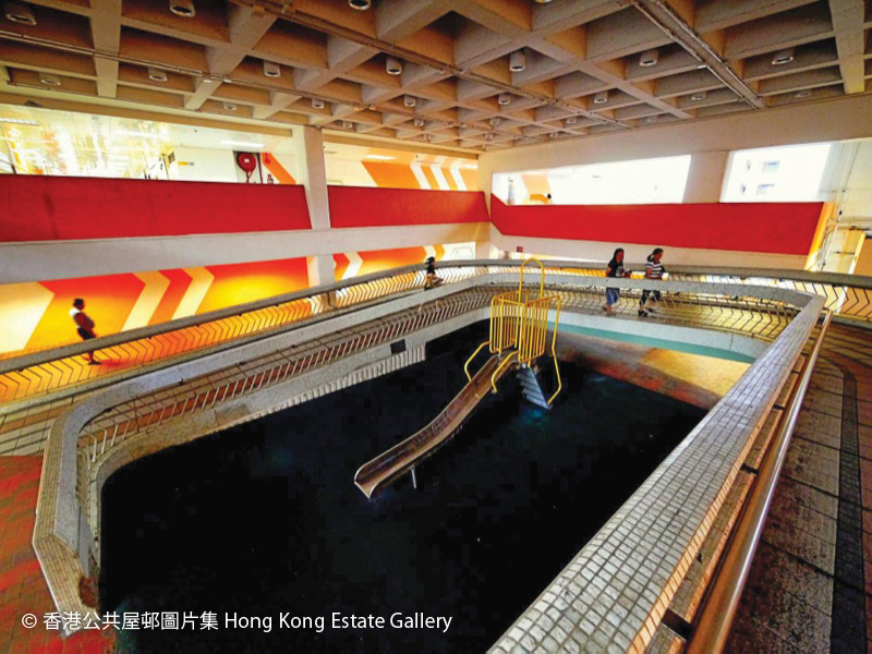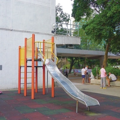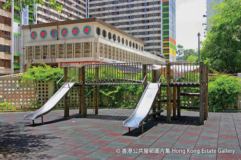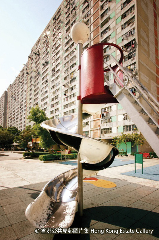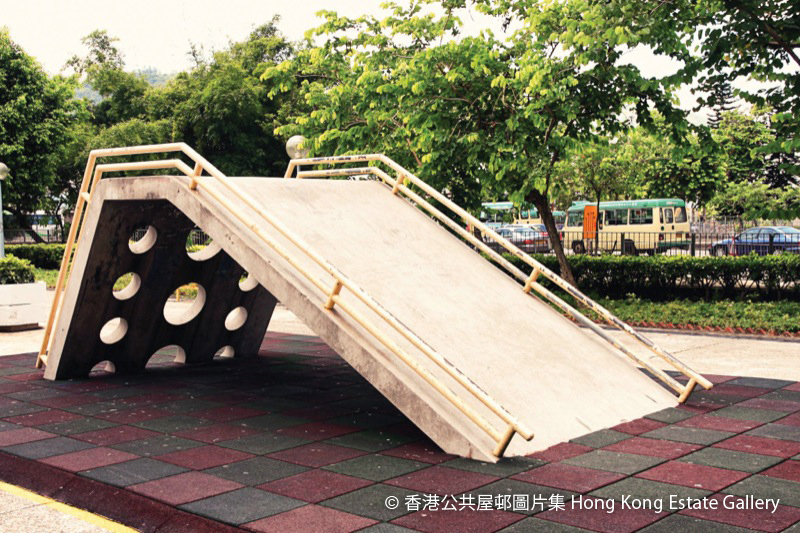一九七零至九零年代,香港大舉興建公共屋邨。由於居住單位較狹小,居民都會在公共空間歇息。當年每條邨都各有特色,遊樂場設計很多都別具心思,例如這個配合斜坡、石屎管建成的超長鐵滑梯!