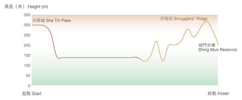從沙田坳士多前行,不久便看到有分岔路(W047),應選擇左方的泥路下行往紅梅谷方向。旁山而行,沿路有不少由晨運人士開闢的觀景位,供欣賞右方位於馬鞍山郊野公園的水泉澳山嶺風光。在此往下走,沙田一帶的屋村就像位處山谷下寧靜的小市鎮,沿路下行,在天晴的時候,這裡是絕佳的拍攝地點。下行到通往沙田頭新邨的小路前,可於涼亭附近俯瞰沙田全景。接著的路段旁獅子山隧道而行,沿路都可遠眺沙田多幢新建的建築物。不久,左方有路牌指示通往紅梅谷自然教育徑。每年五至六月間,紅梅谷內都長滿果實嫣紅的水楊梅。