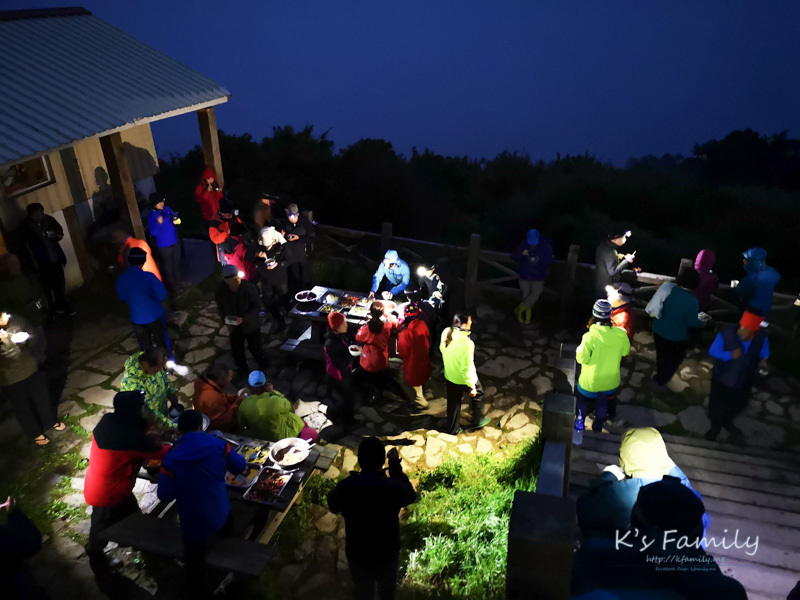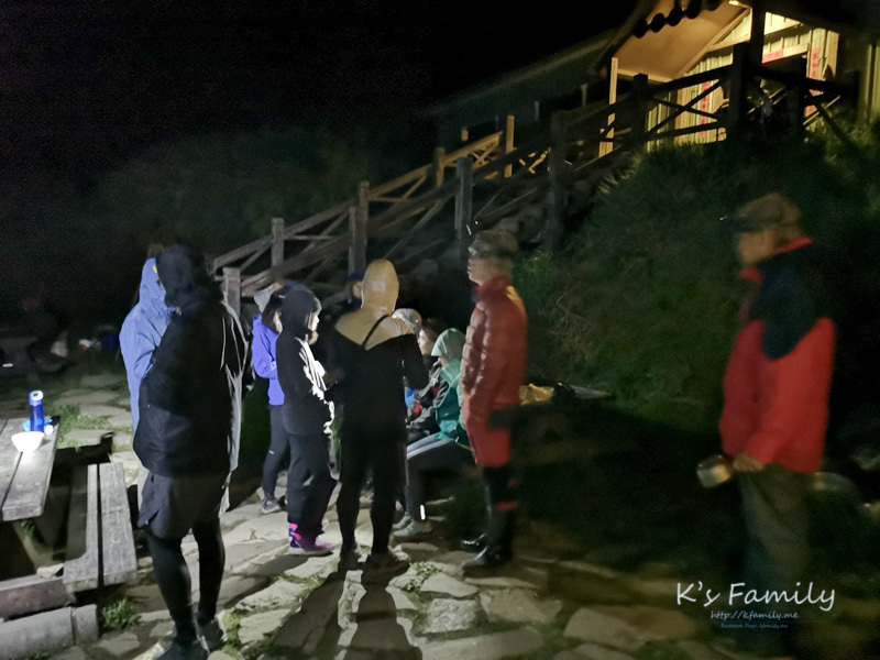 晚上六時多,完成晚餐的登山者幾乎都返回宿位準備睡覺,儲備體力應付半夜的登山行程,然後半夜一點起床,在山莊簡單地吃點麵食當「早早餐」,一行十六人便帶上行裝重新出發,開始摸黑攻頂路段,前往我們的最終目的地—雪山主峰。