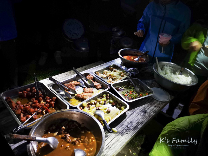 晚餐於三六九山莊享用,原以為只是隨意地吃點麵食及白飯配罐頭,結果晚餐豐富程度是所有登山團員也始料未及。餐點以自助形式供應,當日菜式包括:烤香腸、蕃茄炒蛋、節瓜豆乾、香煎雞排、香菇排骨、清炒時蔬……白飯及湯品無限食用,對於辛苦地登山一整天的團隊成員來說,這絕對是世界上最美味的飯菜。