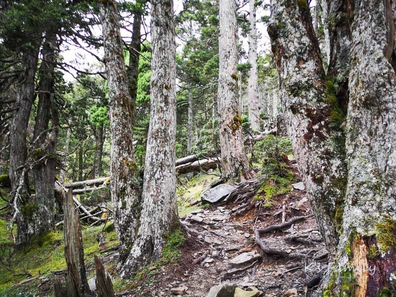 離開圈谷後,再次走進一個完全沒有印象的地方—黑森林。黑森林為全台灣海拔最高的冷杉純林,整個森林都是高聳的杉樹,全方位層層疊疊地包圍著主要山徑,每一位登山者就像頓時誤入「大人國」,在巨大的樹林中顯得如模型小人般迷你。黑森林區雖有路標指示前進方向及距離,但部份路段仍然有點雜亂,尤其是水源區一帶,更要小心迷路。當穿過黑森林後,看見「之字型」的山坡,距離三六九山莊便不遠了。