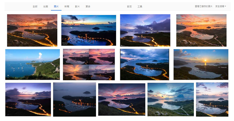 上網 Google 「田下山」相關圖片,大致就會得出類似下圖的結果。搜到的大部份都是拍自差不多同一角度,以布袋澳及清水灣鄉村俱樂部為主要景觀的照片,當中又以拍於黎明日出時份的佔大多數。