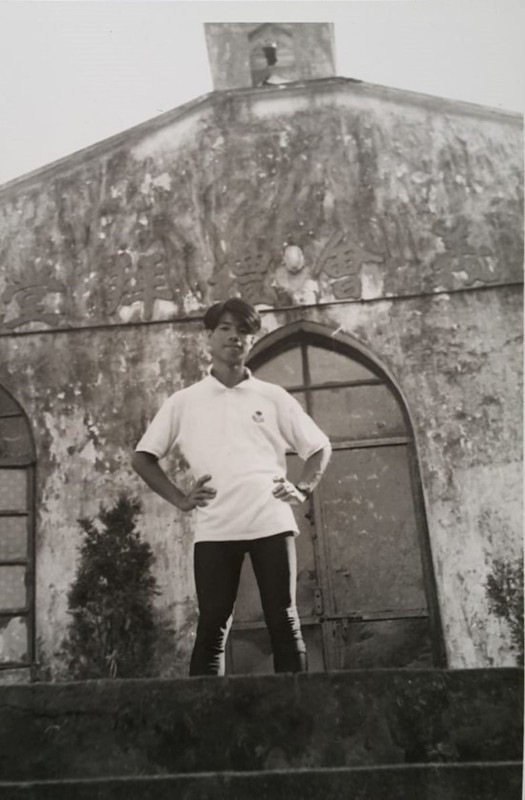 ▲ 阿建在關懷礦工社區的教堂下留影(教堂為信義會禮拜堂,今日的鞍山探索館) 。