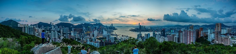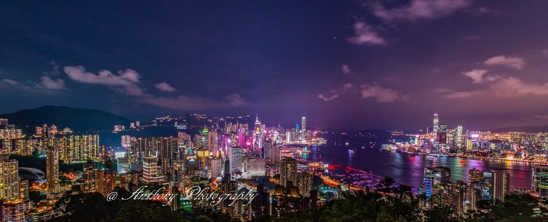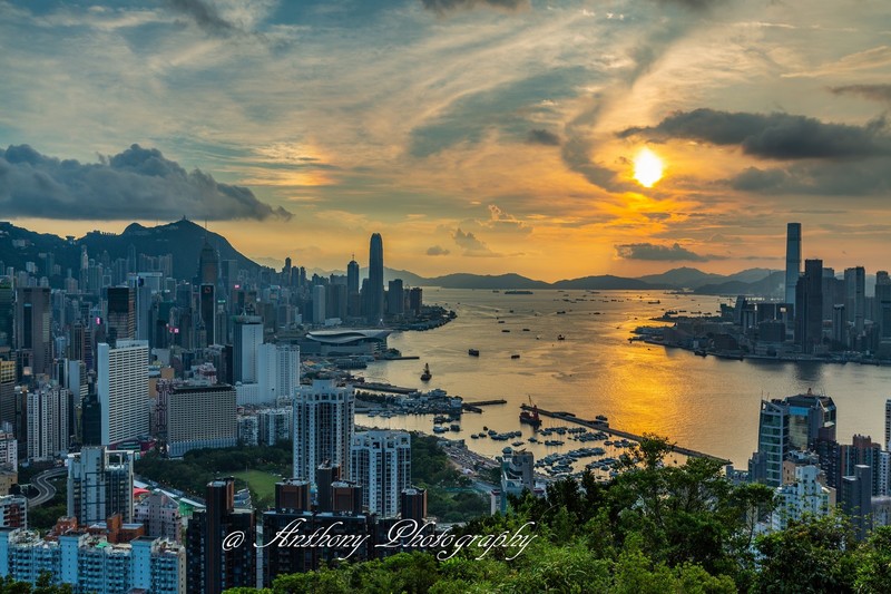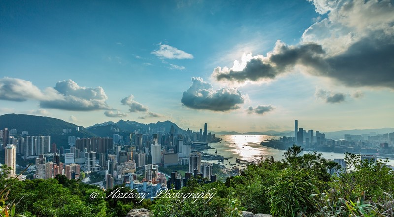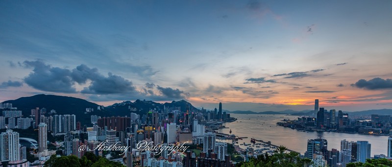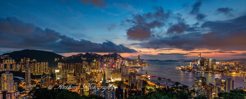 從紅香爐峰觀看維港有高而近的感覺,銅鑼灣避風塘就在你面前,IFC 及 ICC兩座摩天大厦就像守護兩岸的門神般雙對聳立,夏天日落時太陽便在兩位門神中悠悠下降,尤如兩名天將護送着觀音大使下山休息,好不動人呵,令人感覺大自然的雄偉浩瀚。日落後兩岸遂漸亮起晚燈,這時太陽的暮光把維港這位美人塗上胭脂花粉般,使肌膚白裏透紅,縱使你是何等硬朗的漢子也要在這美麗如楊貴妃的伊人面前溶化,任你是何等鐵石心腸也要屈服於她的温柔。