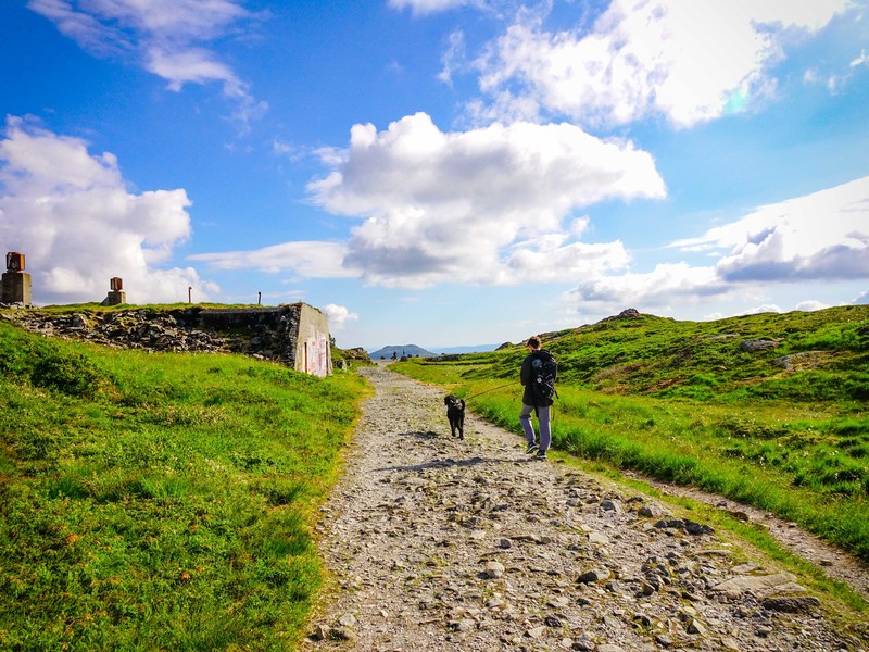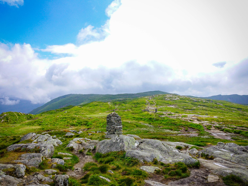 在 Ulriken 的咖啡廳休息了一會就繼續起行,向卑爾根第二高山 Rundemanen (568m) 出發!夏天在這裡遠足不易迷路,皆因山路十分明顯。路邊亦長滿青草植物,沒有植物的石地都是山徑,很寬倘,亦不像香港有需要「爆林」的可能性。反而在冬天,整個山頭都鋪滿厚厚的雪,山徑,植物甚至樹都在白雪之下,就要靠沿路的「石塔」來引路了。它的功用就是引導你的方向,天氣好的話就可以遠遠望到石塔的位置,只要不停向石塔的方向前進,就不會迷路了。