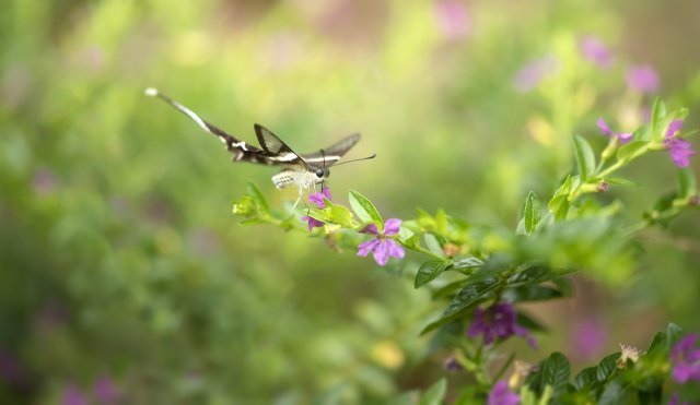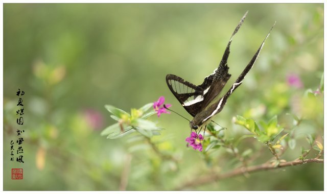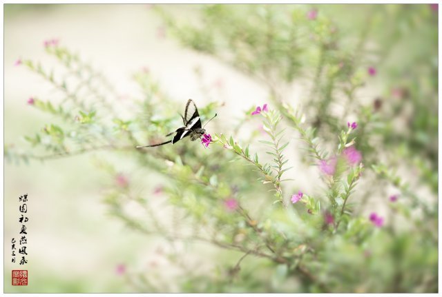 拍攝蝴蝶,筆者喜歡選擇動態多於靜止。空中飛翔的當然想拍,但亦難拍,能否拍得到,運氣比器材更重要,能捕捉短暫停留於花朵上採蜜的瞬間,已算是交出合格的功課。然而這次的自設燕鳯專題,自我要求略高於合格水平,尤其在構圖方面,希望能夠做出比較豐富的景物配襯。於是,為求達到目的,小弟又一次不按常規,選用了 105mm 微距鏡頭進行拍攝。