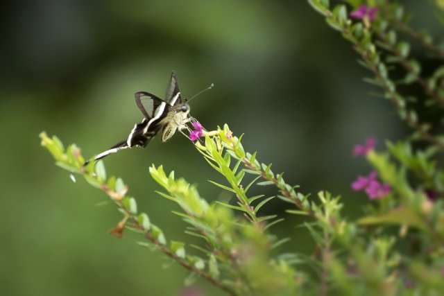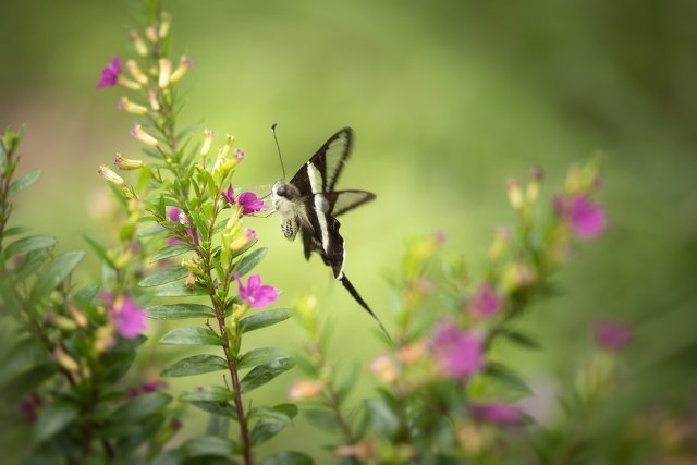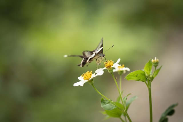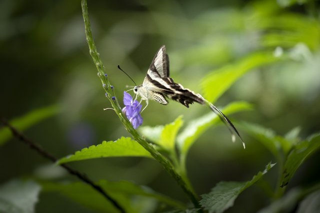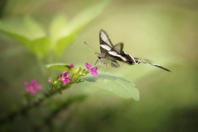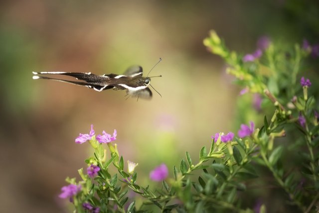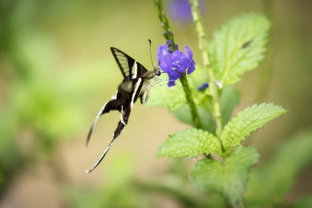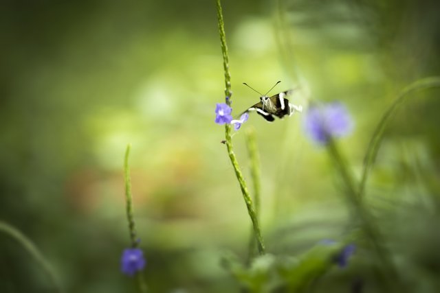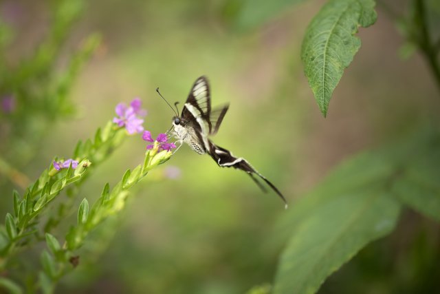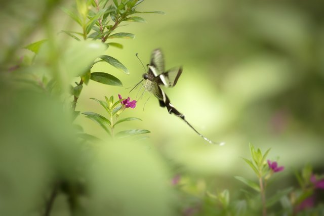 按照傳統智慧,拍攝蝴蝶使用的鏡頭,大致上兩個原則:一、大蝶用長焦,小蝶用微距;二、飛翔的用長焦、靜止的用微距。然而燕鳯蝶比較特別,首先是體型不大不小;在鳯蝶之中,屬細粒一族。其次是飛翔時振翅頻率雖然很高,但移動速度卻相對緩慢,採蜜時,飛行路線亦往往有跡可尋。以此而論,拍攝燕鳯蝶選用的鏡頭,應是長短皆可。然而一再衡量之後,結果還是選取後者。