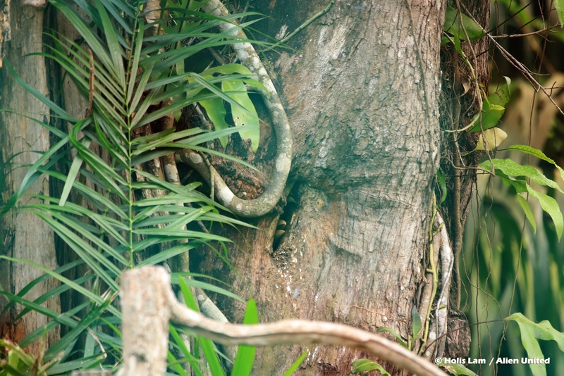 當我們初見Jimmy的時候,他正在一棵長滿果實的樹上大快朵頤,他一見到我們,便立即躲進比較隱蔽的位置,一邊留意我們的動靜,一邊繼續進食。對於我們來說,能這麼近距離觀察野生的犀鳥,實在太幸運了,然而對於Jimmy來說,我們這些人類卻為他帶來慘痛的回憶。