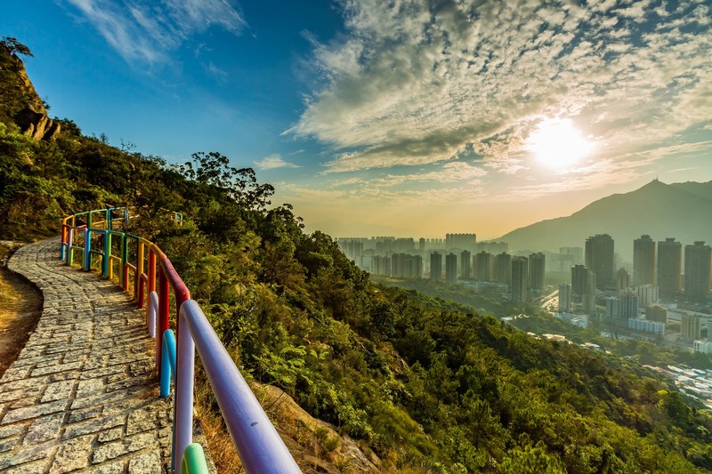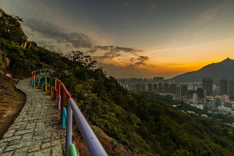 於彩虹橋上可看到正前方亦是西面的青山在兩公里外屹立,而屯門市便是被青山及九逕山兩山夾着亦保護着,而左面遠方有龍鼓水道在點綴,而右方則有圓頭山等等,如夏季上山拍攝夕陽會被583米高的青山遮擋,效果不佳,反而11月至1月期間太陽降落青山左方,效果更佳。