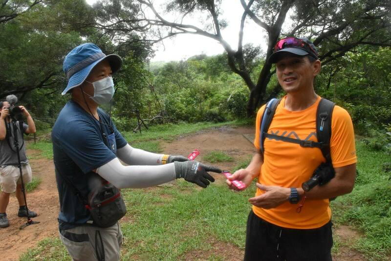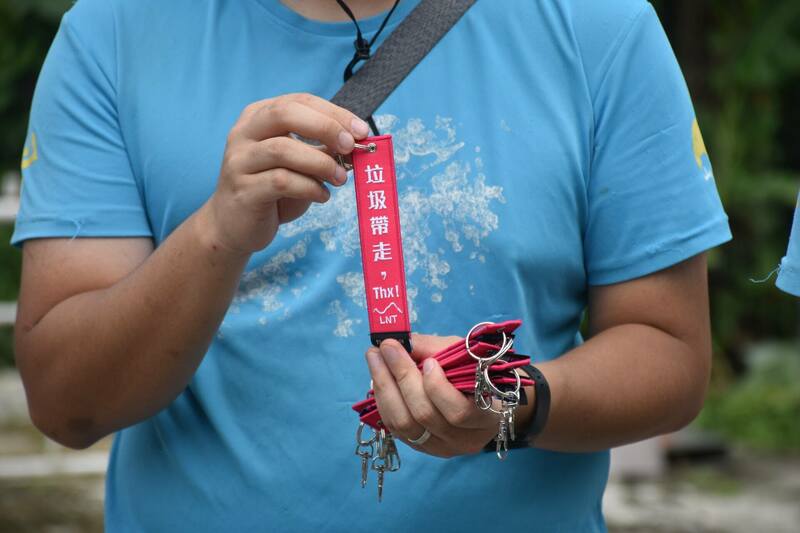 ▲ 義工除了上山執垃圾外,還會向行山人士派發這款背包提示帶。(顏銘輝攝)