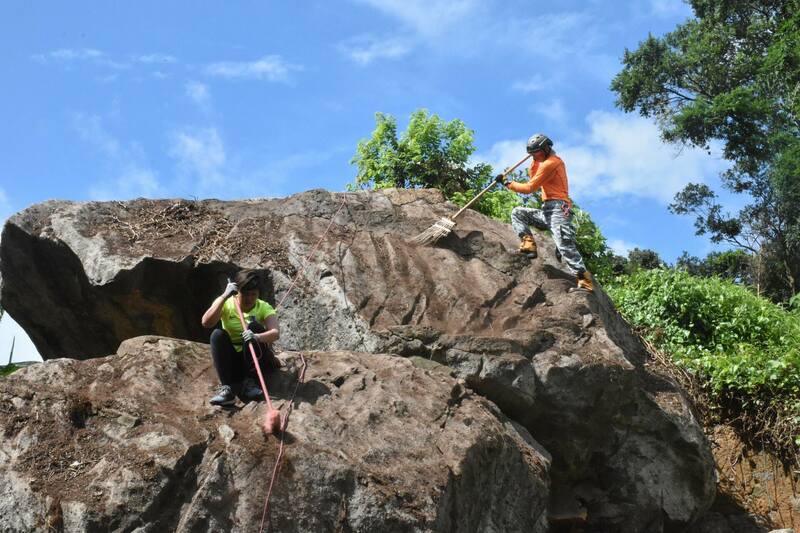 ▲ 凌劍剛(右)於山友在英雄石上清理枯葉及植被。(顏銘輝攝)