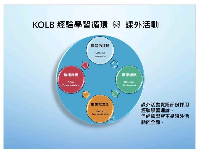 課外活動的學理基礎源於經驗學習理論,據庫伯(Kolb, 1984)的經驗學習圈(Experiential Learning Cycle),學習循環包括:(1)具體的經驗,(2)反思觀察,(3)抽象概念化,和(4)積極應用。(圖三)