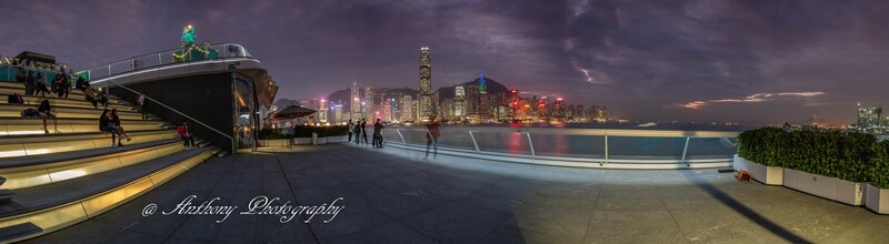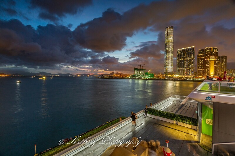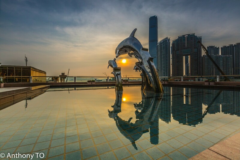 第二處介紹的拍攝點是中港城碼頭的天台,除了拍攝無敵的西維港日落景色外,更可把西九龍高聳建築物例如ICC、凱旋門等作為襯托,而天台亦有許多精美的擺設可作拍攝的題材,小弟對一個擺設物情有獨鍾這是一個水池上三隻海豚的銀色金屬彫塑,在晚上被不同顏色射燈照射著顯得七彩繽紛無窮吸引。