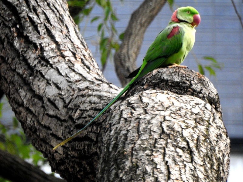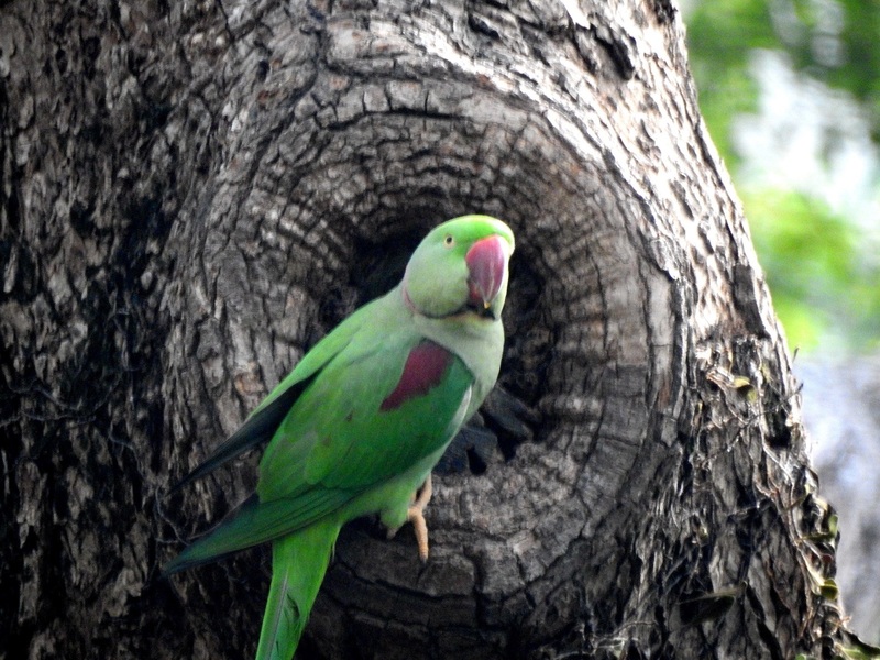 聖誕節,我和爸爸到九龍公園探訪一群綠色小精靈——紅領綠鸚鵡。牠們 常在林地、公園中出現,有一身 鮮豔亮綠的羽毛、 修長尾羽及 亮紅色的嘴喙,雄鳥有玫瑰紅色的頸絲,因而有紅領之稱。牠們喜歡在洞穴中營巢,如樹洞或 建築物的孔洞,常常一群一群行動,叫聲很嘈雜。