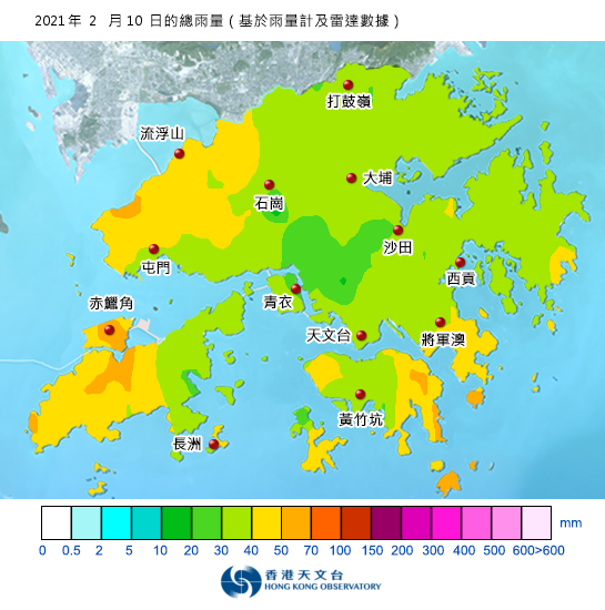 比較氣候數據,1991至2020年二月份天文台降雨量的月平均值為38.9毫米,單是2月10日的全日降雨量已頗為接近這個數字。至於2月的全月總雨量則還要再等兩星期才會揭盅。