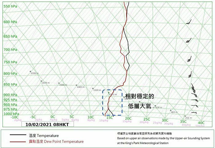 回看2月10日的天氣情況,儘管高空擾動有利氣流抬升,可是接近地面的大氣在「大東風」的持續影響下比較清涼,本港日間氣溫普遍徘徊在16度左右,低層大氣也相對穩定(圖二),結果「雷電小子」只是短暫出現在香港以東約150公里的廣東沿岸海域。