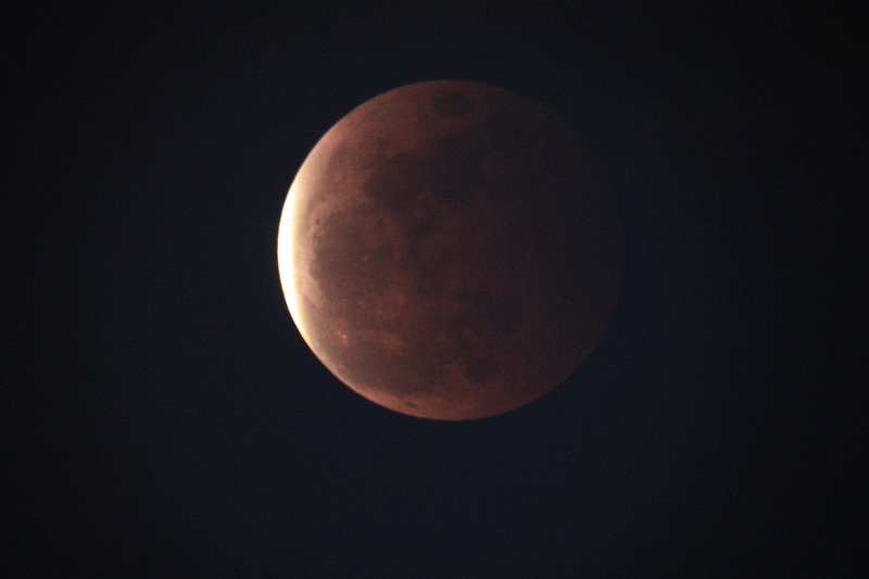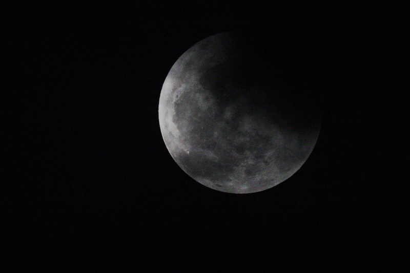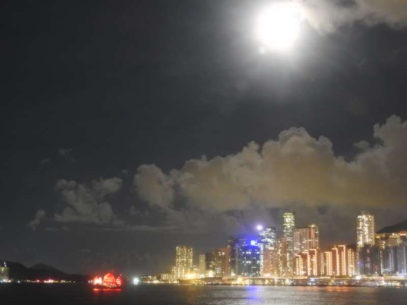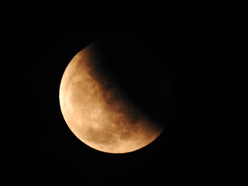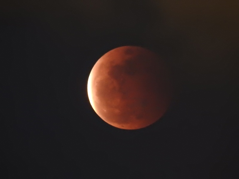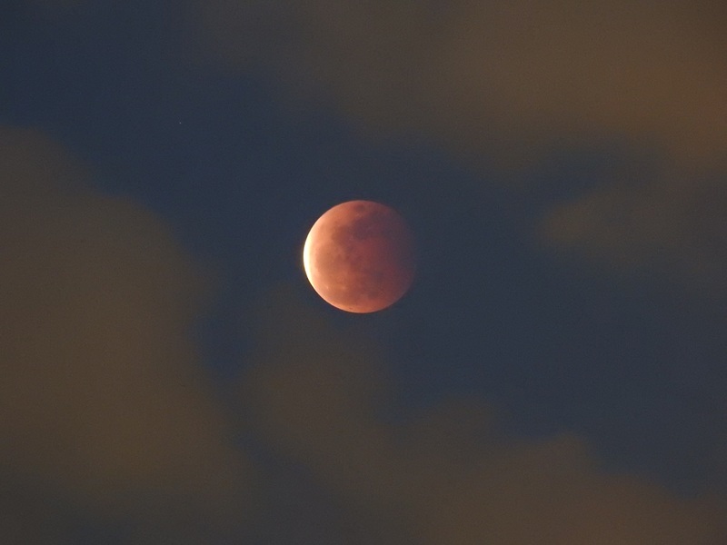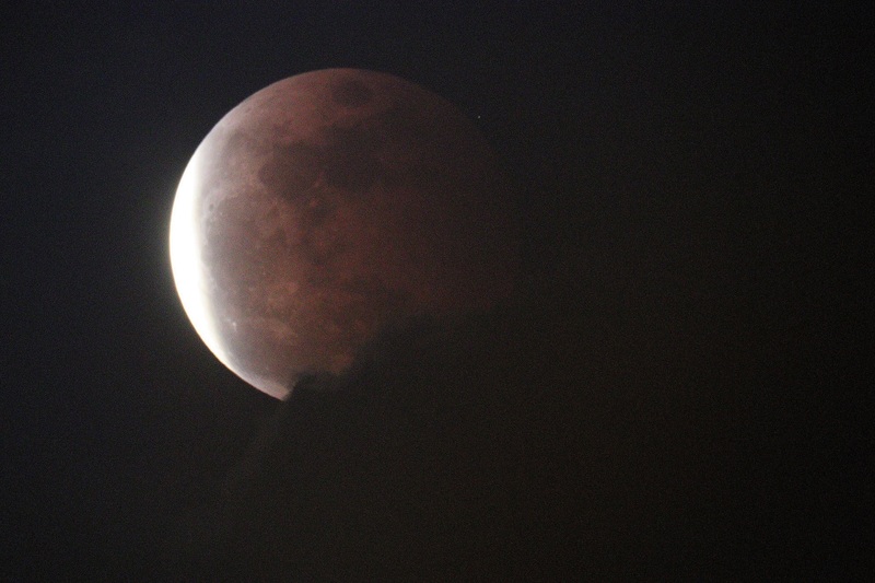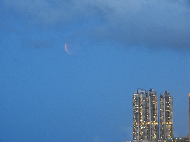 這晚天上有很多雲,常常遮蔽月球,加上天色未晚,所以我們在全食開始時仍看不到月球,直至7點19分左右,大家才從雲罅中看到月食,當天色入黑後,食甚開始,一個血紅色的月亮便展現在大家眼前,一片又一片的歡呼聲與快門聲交織,大家十分興奮。大約7點28分,全食結束,月球漸漸生光,變成了月偏食。大約9點,月亮變回又圓又大的滿月。雖然天氣很熱,但能看到這罕見的月全食,也是值得的。我還接受了有線電視台和法新社的訪問,很有趣的體驗呢!