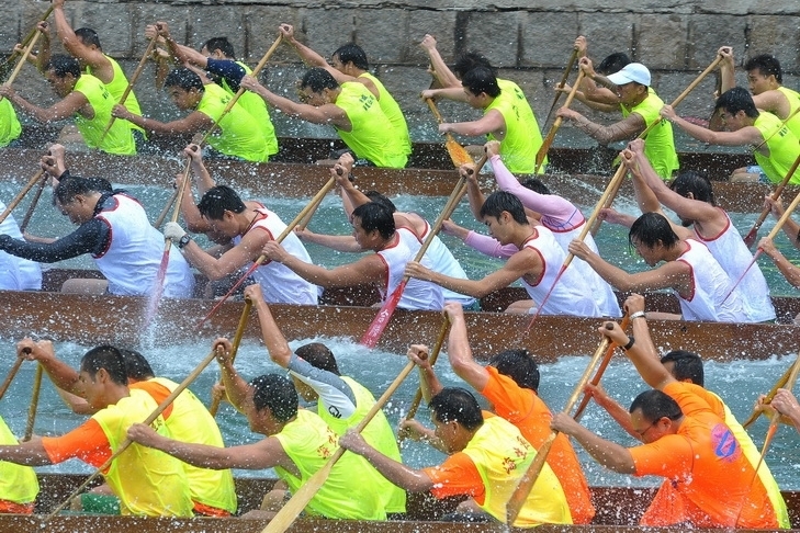 無論是為了紀念屈原或伍子胥,或是龍圖騰崇拜,龍舟競渡的習俗算是端午節的重頭戲,在沿海地區和臨江濱岸地方的龍舟競渡尤其盛大壯觀。龍舟一般窄而長,形象似蛟龍;船身有龍頭、龍尾和鱗甲等裝飾,結繫上七色綵帶,插上旗傘。除了龍舟上打鼓發訊號讓划手齊槳划艇,岸上亦會敲鑼打鼓、鳴放鞭炮,場面十分壯觀。