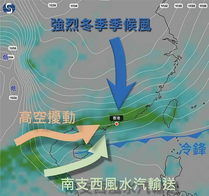 有別於上次的冷鋒過程,今次大氣中、低層較暖濕的南支西風會持續影響華南,提供充沛的水汽。同時,在冷鋒以北的海面及地面,強烈冬季季候風帶來的冷空氣將會形成一幅廣寬的「下墊面」,亦稱鋒面。水汽從南向北迎鋒面而上,配合較高層擾動氣流的助攻,加強抬升作用,令大氣變得不穩定,有利廣泛而持續的降雨。下雨加上大北風,身體會感覺特別冷,請大家多穿冬衣,注意保暖,並留意天文台最新的九天天氣預報。