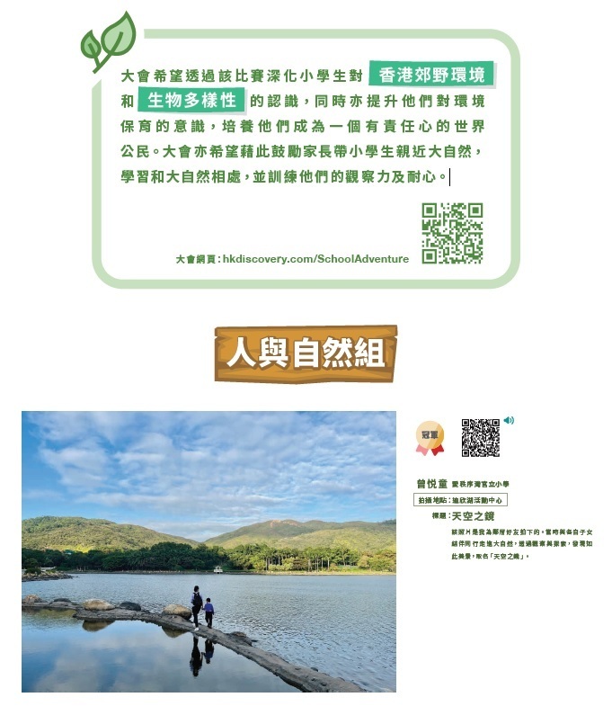 為持續推動香港環境生態教育,「野外動向 HK Discovery」與「愛秩序灣官立小學」再次聯同來自十八區的籌委小學合辦【第四屆全港小學野外大搜查】學界比賽,並推出【自然生態親子攝影比賽】。比賽分為動物組、植物組及人與自然組,三個組別經過評選後決出一眾得獎作品。