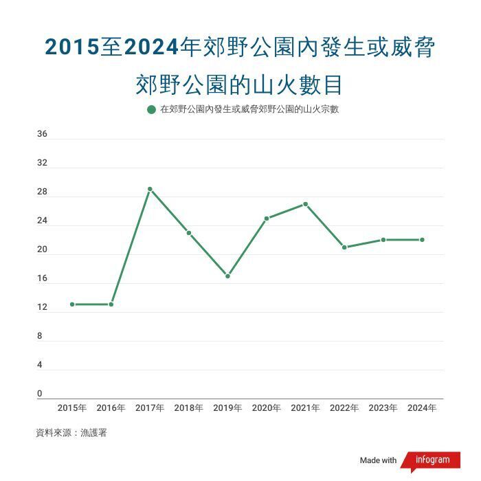 今年本港已發生多宗山火,其中雞公嶺在一月先後發生兩場山火,受影響面積共500公頃。去年12月28日,大欖郊野公園大棠發生大型山火,其中一條火龍長約200米,焚燒逾25小時才救熄。漁護署指,動用超過50名山火隊員參與撲救,受影響範圍有約82公頃,燒毀約3000棵樹木。