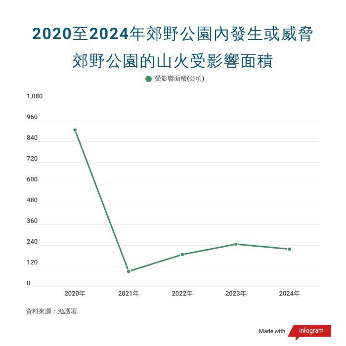 周有誠表示,近年本港山火數目有下降趨勢,平均一年20多宗。根據漁護署數字,2022年郊野公園內或威脅郊野公園的山火有21宗;而2023年及去年均有22宗,受影響面積逾200公頃。署方指,元朗、屯門區及大嶼山的郊野公園記錄到較多山火發生。