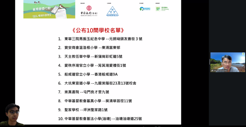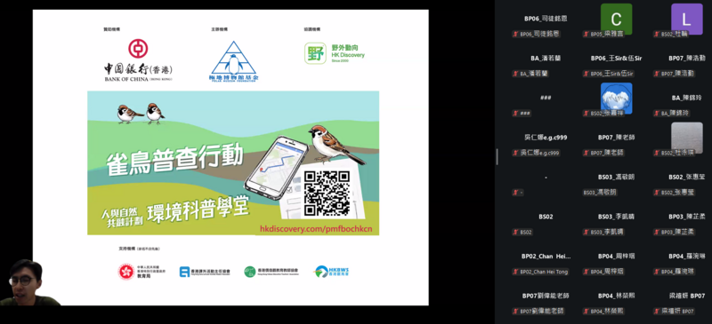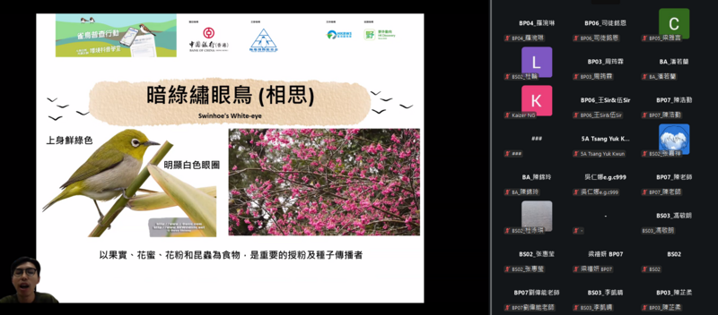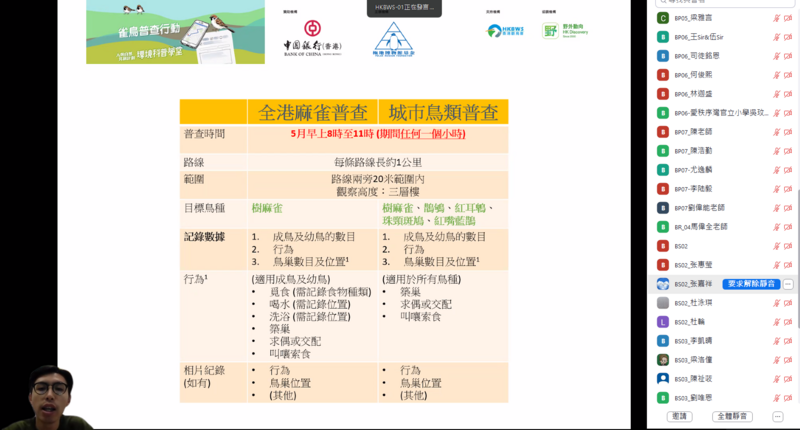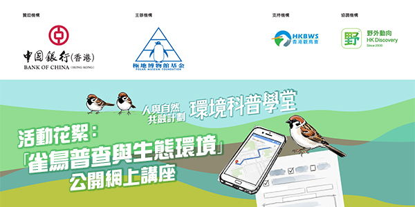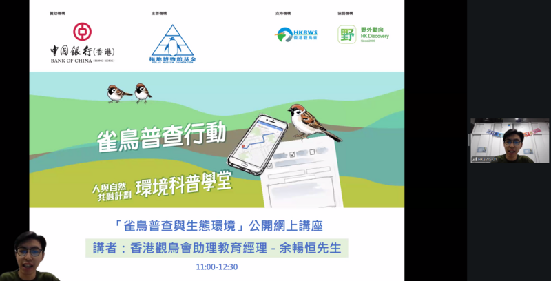 是次公開網上講座旨在向全港中小學師生及社區人士推廣雀鳥普查的理念與價值。講座內容包括如何記錄本地鳥類的品種及數量,並帶領參加者認識香港多元而豐富的生態系統。透過普查實踐與知識分享,讓市民更深入了解本港鳥類多樣性及相關保育成果,攜手為守護生態環境出一分力。